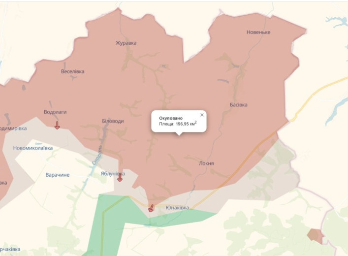 Російські війська просунулися поблизу Яблунівки та Юнаківки на Сумщині. Наразі площа окупованої території складає понад 200 квадратних кілометрів. Про це повідомляє аналітичний проєкт DeepState. Згідно з їхньою картою, ворог просунувся в Юнаківській